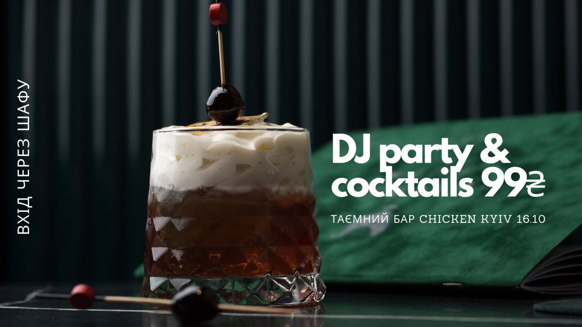 Цієї п'ятниці заходь у шафу Chicken Kyiv та шукай пригод: діджей-сет, який точно тебе розтанцює, та спеціальна коктейльна карта, в якій всі коктейлі по 99 грн, які розтанцюють тебе ще точніше.