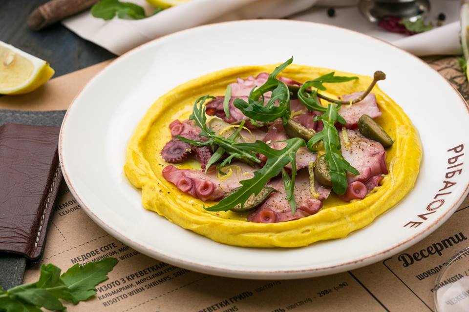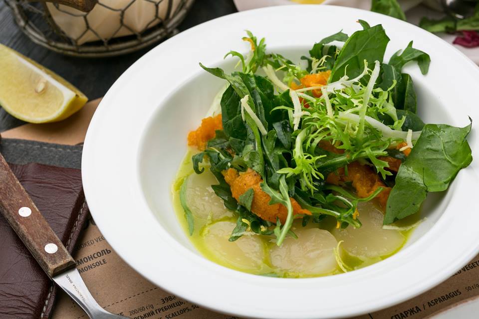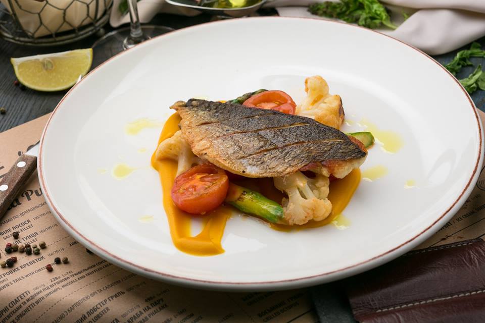 Ідеально свіжий риба та гарнір, який максимально пасує саме до неї. Наприклад, філе лосося подаємо з кремом з пастернаку та печеними овочами. Ніжність риби відтіняється свіжістю соуса. Для ніжної дорадо – солодкуватий крем з батату, який вдало підкреслює смак.