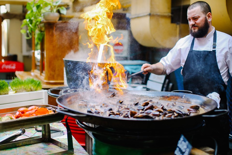 Одеський дворик — просторий та інстаграмний. У величезному казані шеф смажить мідії у вершковому соусі з ніжною кукурудзою. Поряд — соковитий шашлик зі свинячого ошийка, бургери з індички та пікантні смажені перчики. Тут відкривають устриці, там наливають вино.