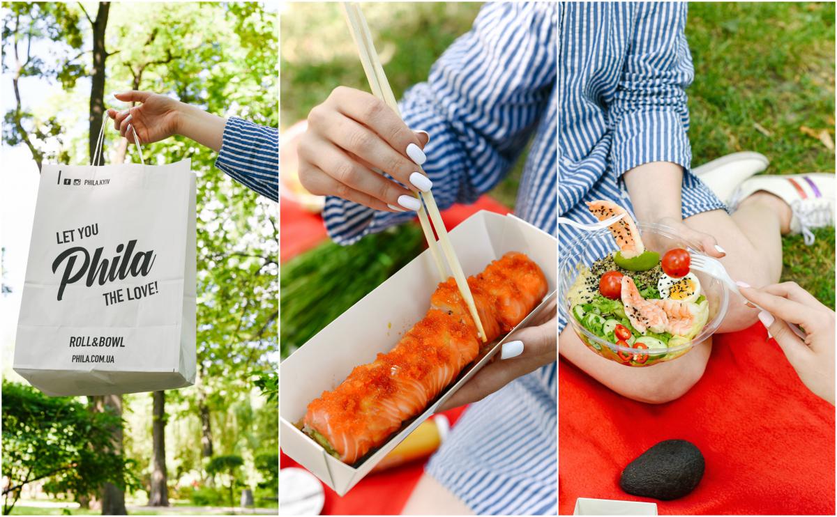 Збираємось на пікнік: у парку Шевченка, ботсаду біля університету, неподалік цирку чи де завгодно ще. Заходимо на phila.com.ua і замовляємо роли Філадельфія, норі-шаурма-роли, боули, салат з авокадо і навіть охолоджене вино. Через 39 хвилин отримуємо замовлення — і влаштовуємо свято. Можна забрати самостійно на Шота Руставелі, 10.