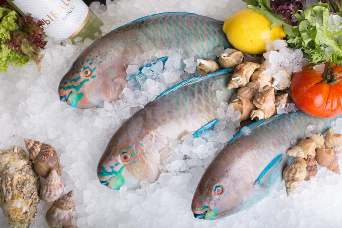 Різноманітна охолоджена риба лежить на льодовій вітрині, просто перед гостями – можна обрати будь-яку, і за вашим бажанням саме її приготують на пару, на грилі або запечуть в солі. Наразі пропонуємо камбалу плейс та тюрбо, луціан, рибу-соняшник та королівський морський язик, рибу-місяць, рибу-папугу, середземноморську барабульку… Асортимент змінюється (розширюється, доповнюється) майже щоденно.