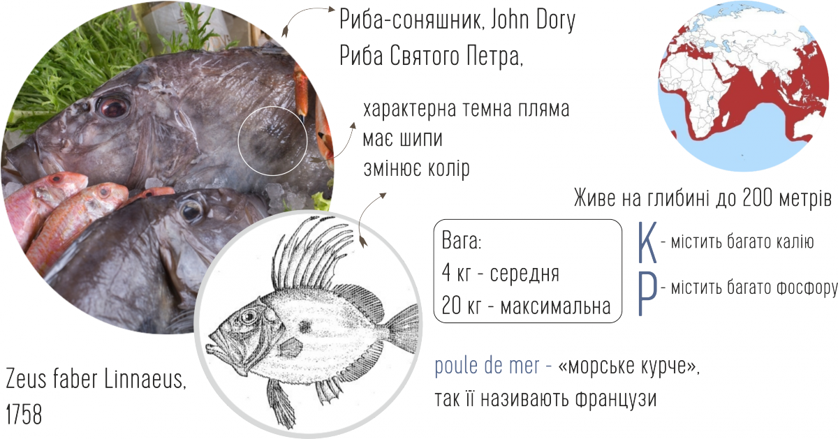 Почнемо з риби-соняшника, вона ж «Риба Святого Петра» (не варто плутати з тілапією, яку теж так називають), вона ж poule de mer або «морське курча» на думку французів. Риба неймовірно смачна, з величезним вмістом фосфору та калію.