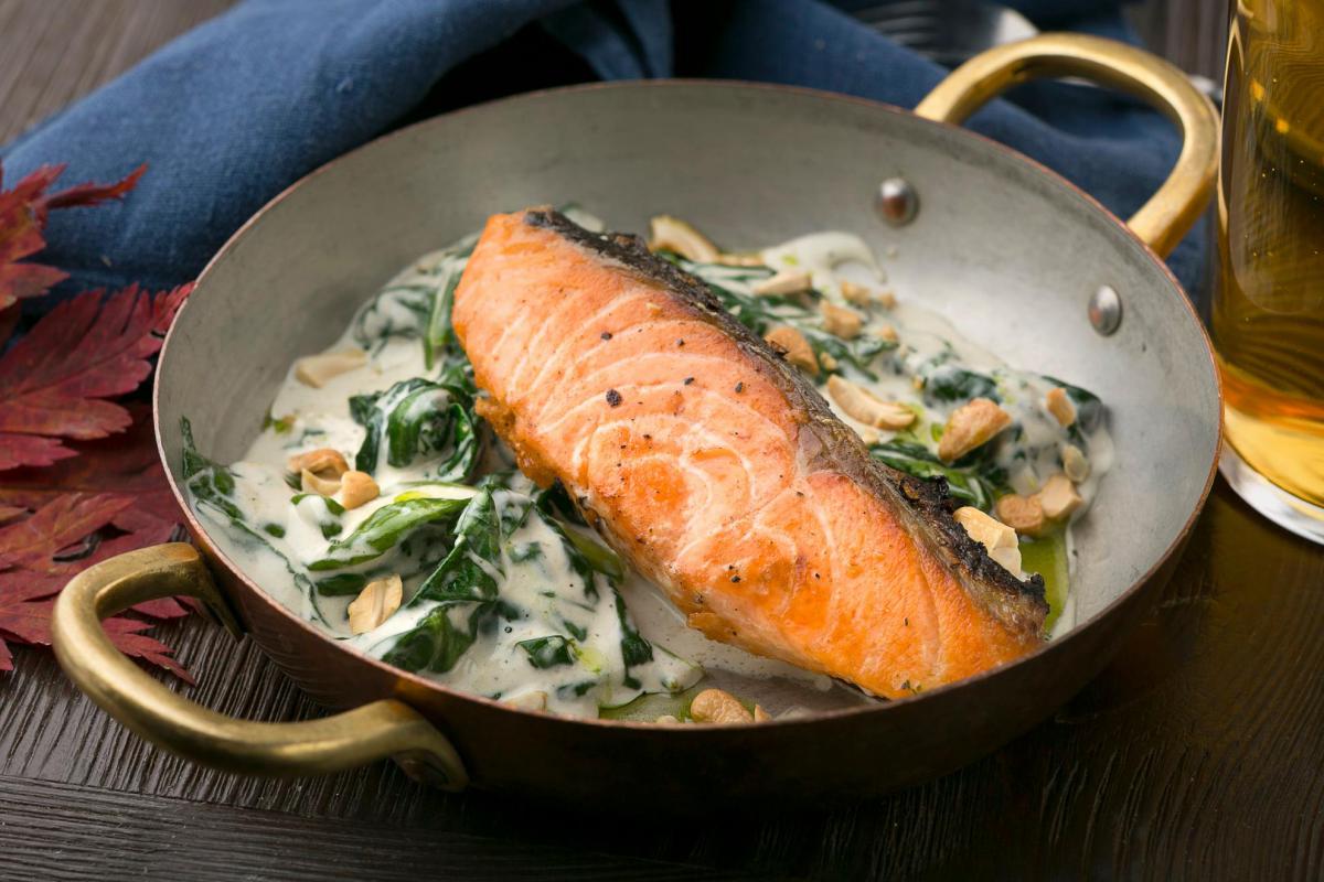 Стейк із лосося зі шпинатом, тушкованим у вершках, і горiхами кеш'ю - 229 ₴