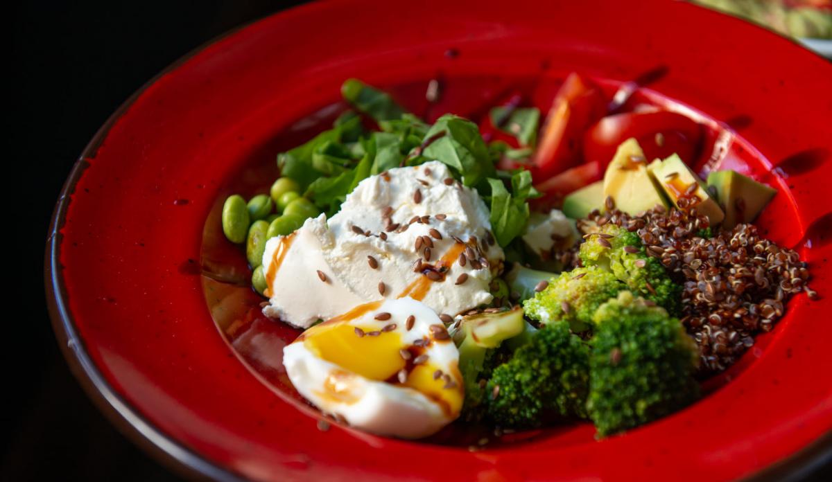 Боул з авокадо, бобами едамаме ,вершковим сиром, кіноа та свіжими томатами – 139 гривень