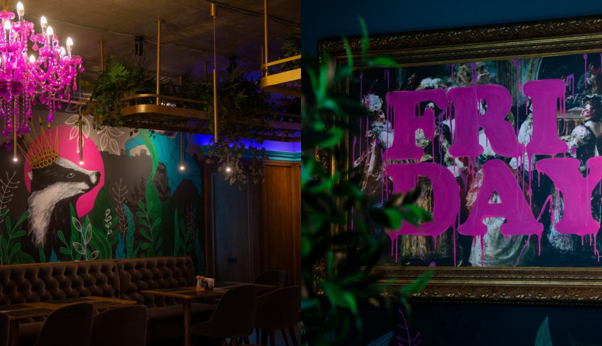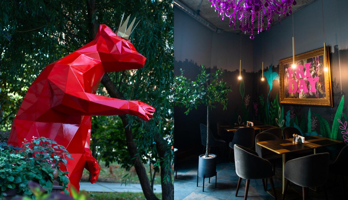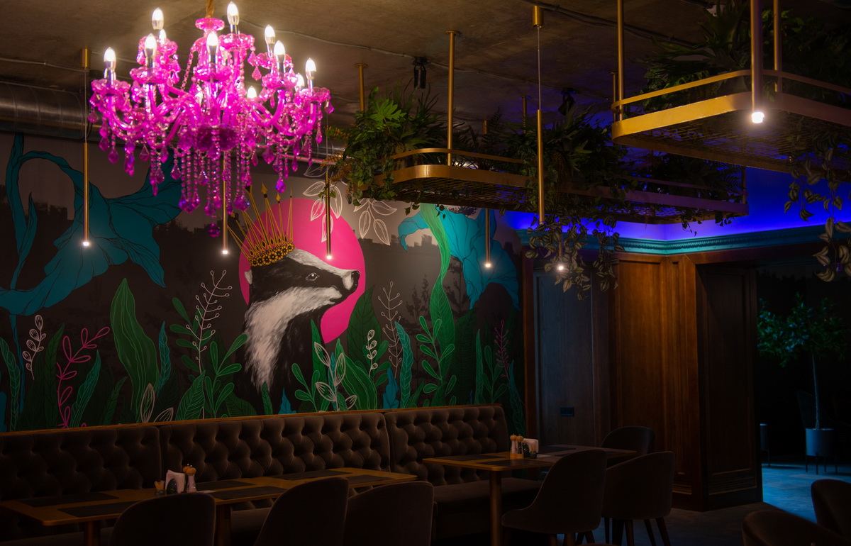 В ньому 2 великих зали та кілька затишних ніш. Біля входу – скульптура величезного «Барсука» в короні, всередині – сюрреалістичні картини, дзеркала, неонові інсталяції та дуже багато живих рослин.