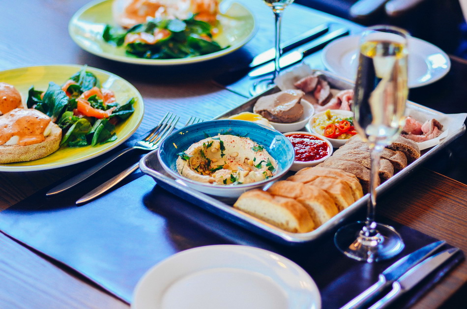 Великий сніданок на двох (2 келихи вина, 2 чашки чаю, сет закусок на вибір, дві порції яєць пашот з лососем або з куркою, 2 солодкі страви на вибір) – 599 гривень.