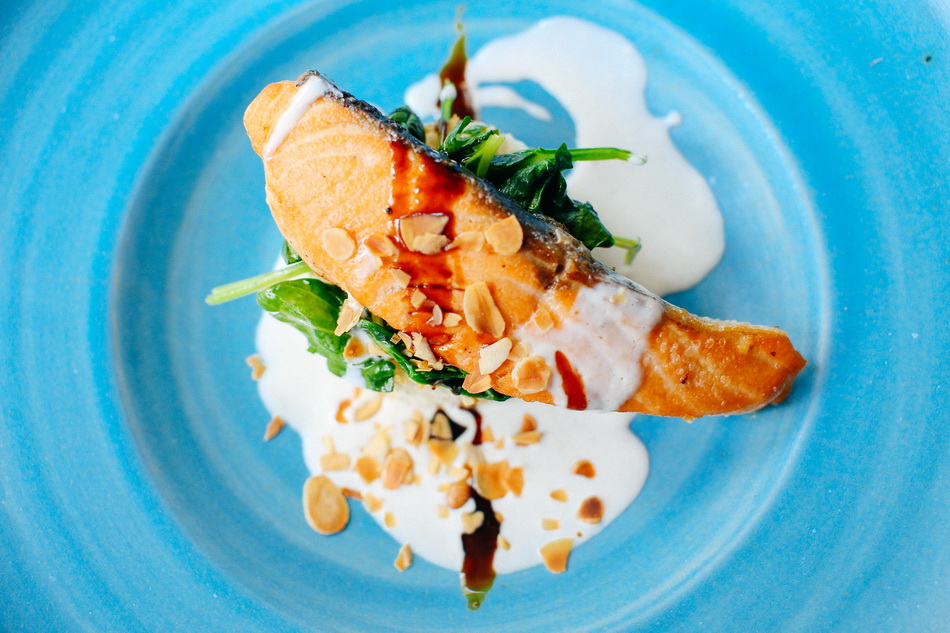 Стейк із лосося з запеченим рисом, шпинатом і вершково-сирним соусом - 198 гривень