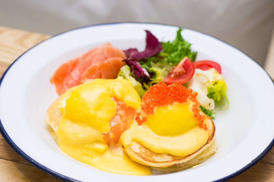 Яйця пашот з лососем, з панкейками та соусом голландез 99₴