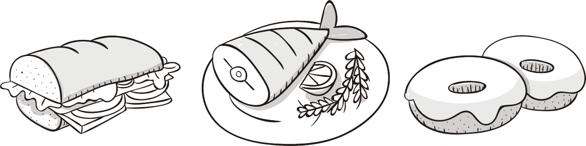 Запечене філе скумбрії з салатом із дайкона та огірка (125 ₴), стейк-салат з в'яленими томатами (145 ₴), бургер зі скумбрією, маринованим солодким перцем та карамелізованими томатами (125 ₴)