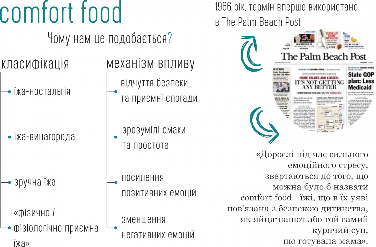 Визначення було таке: «Дорослі під час сильного емоційного стресу, звертаються до того, що можна було б назвати comfort food - їжі, що в їх уяві пов'язана з безпекою дитинства, як яйця-пашот або той самий курячий суп, що готувала мам».