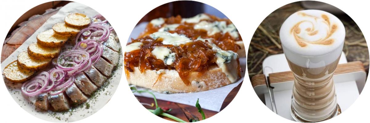 Філе оселедця із запеченою картоплею та маринованою цибулею (89 ₴), брускети з карамелізованою цибулею та козячим сиром (83 ₴), латте (39 ₴).