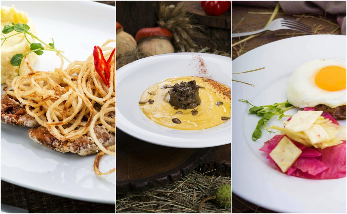 Філе коропа зі смаженою цибулею і вершковим картопляним пюре (149 ₴), гарбузовий крем-суп із жульєном з білих грибів (89 ₴), біфштекс з яєчнею та маринованою капустою (169 ₴)