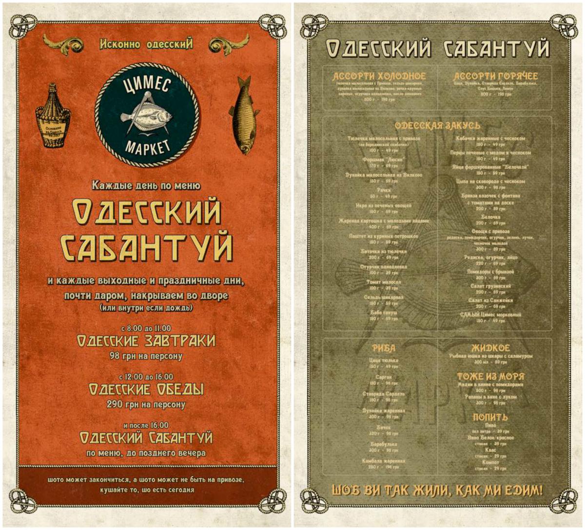 Далі – більше. З 12:00 до 16:00 – великі обіди. Мрія «одеської матусі» та трохи більше. Тюлечка та дунайка, цаца та смажена ставридка, бички та рачки… Величезні казани з рапанами та юшками, глось, сарган, калкан та все найсмачніше «з самого Чорно моря». Мідії в різних соусах та все, що душа забажає. Фірмова закусь: форшмак, баба-ганус, кабачки – як у тьоті Бені, щоб вона була здорова, та цимес як він є. Щоб ви так жили, як ми їмо. За все це щастя – 290 гривень з людини.