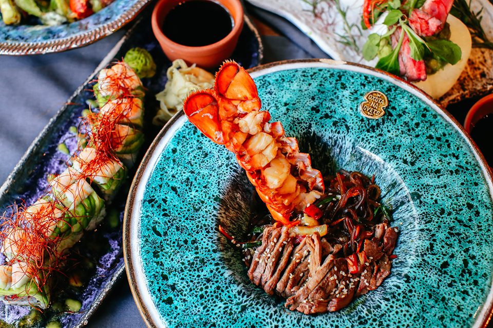 Поєднання яловичини й морепродуктів — це привіт від американської континентальної кухні 70-их, а ще — привід для нових гастрономічних відкриттів. Олег Білоус, шеф-кухар Oxota na Ovets, поєднав японську мармурову яловичину вагю та делікатесні морепродукти: від тунця татакі до лобстера. Тільки гляньте на меню: