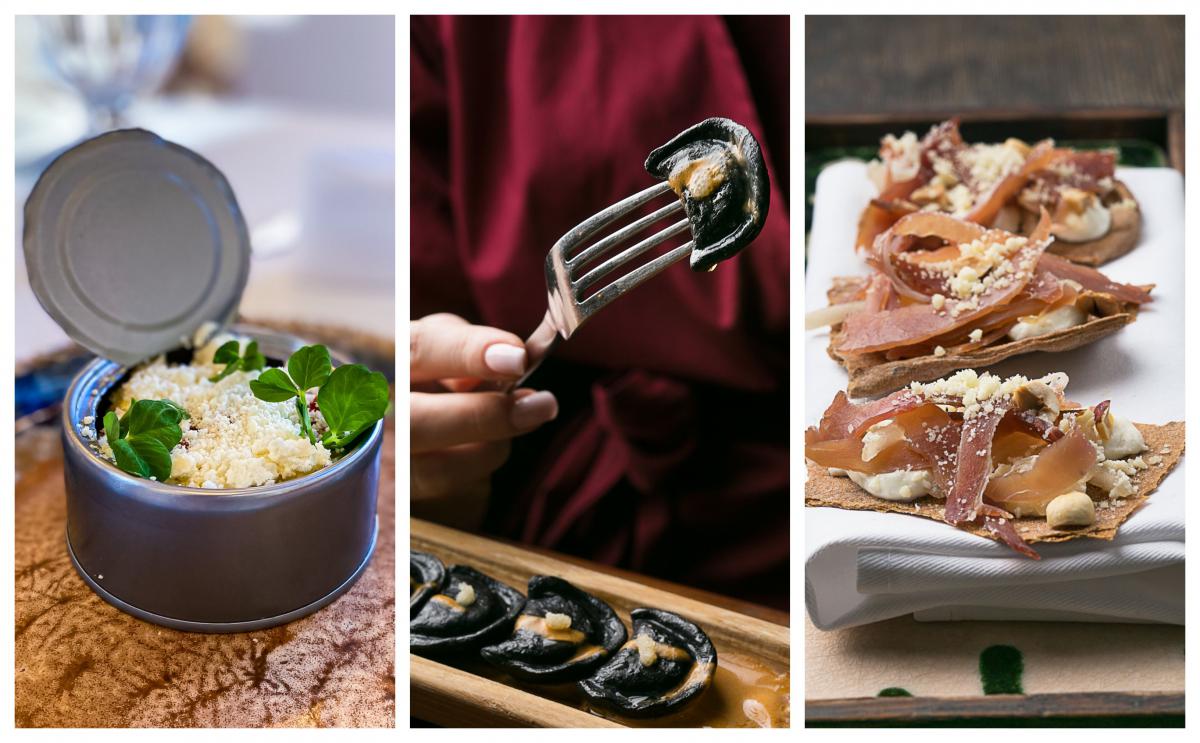 - Чорні вареники з трьома видами риби, соусом із раків та кав'яром форелі