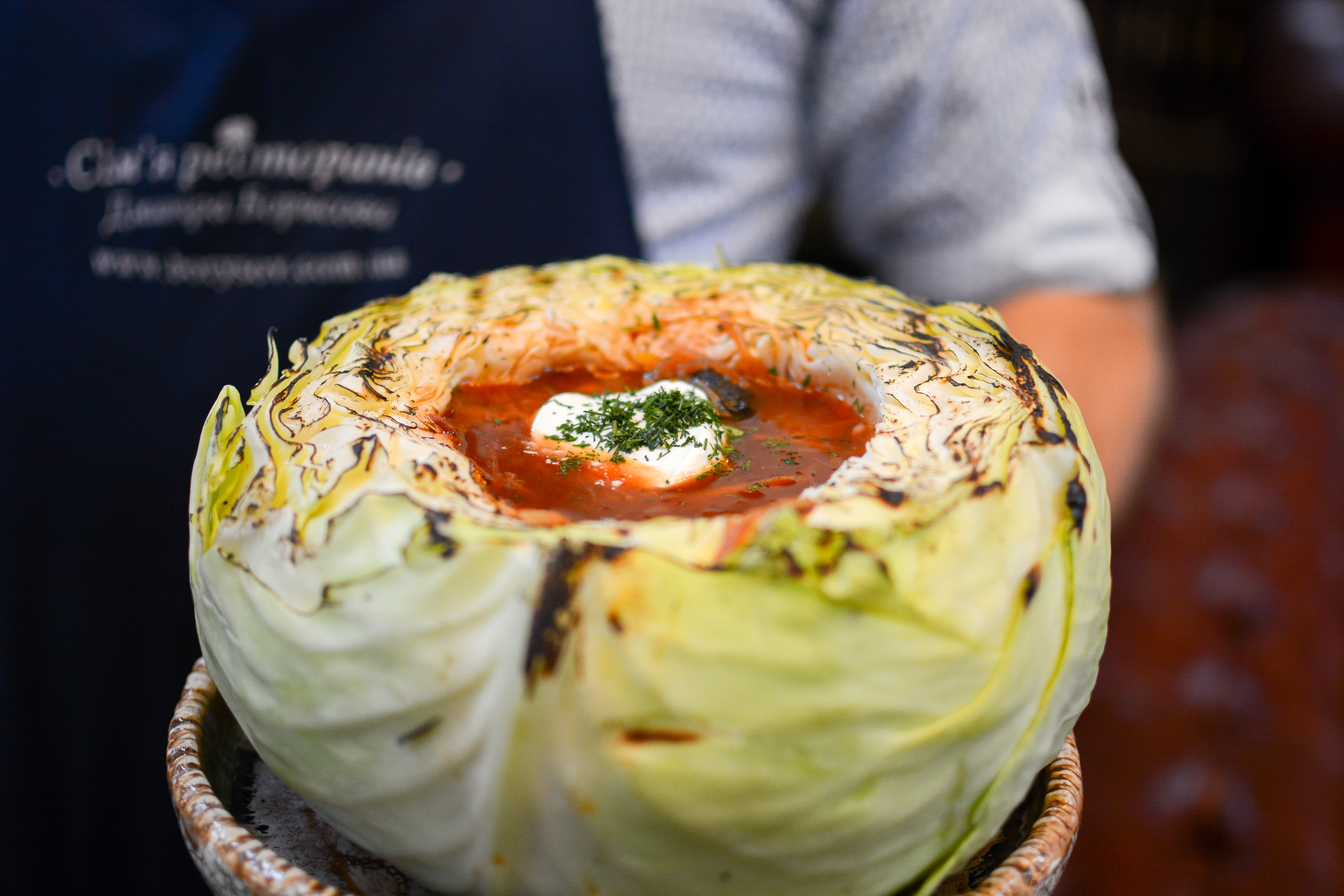 Борщ червоний зі свинячими вушками, копченою грушею, чорносливом та пампушками