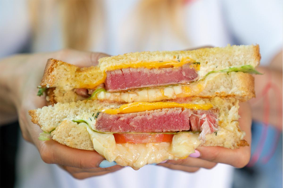 - Мелт зі стейком із тунця на хрусткому хлібі зі свіжими овочами й сиром — 98 грн