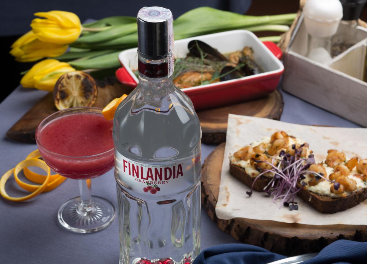 Брускетти з креветками і сиром страчателла, лосось, запечений з морськими гадами, томатами і соусом песто, коктейль Superpolitan (Finlandia Cranberry, апельсиновий лікер, журавлиновий морс, лимонний сік)