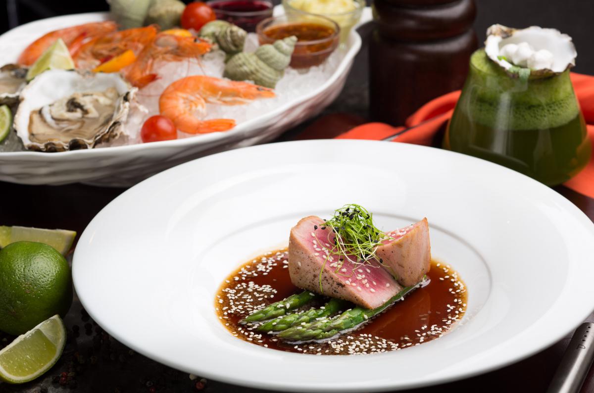 Морське плато (устриці, білоногі креветки, булоти), стейк з тунця зі спаржею, коктейль Mistero Verde (Finlandia Vodka, ігристе, рукола, перлини з сиру)