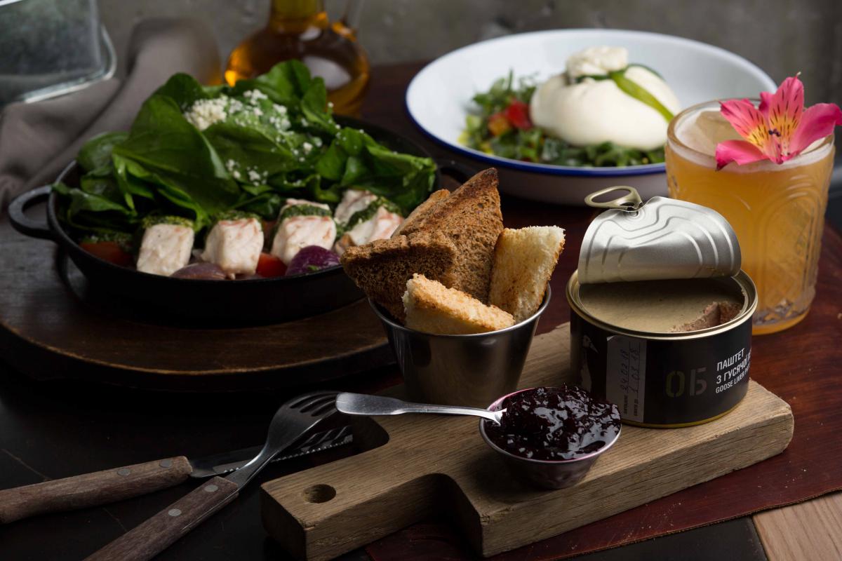 Паштет з гусячої печінки, українська буррата з запеченим перцем, стейк із сома, коктейль "ОБ" (Фінляндія, грейпфрутовий сік, ромашковий біттер)