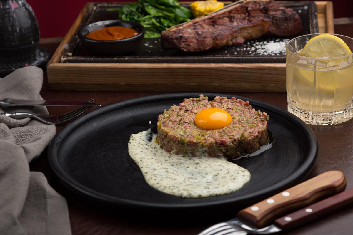 Тартар з мармурової яловичини (готується безпосередньо при гостях), стейк з витриманою мармурової яловичини на кістці, Vatra Sour (Finlandia vodka, вермут, ангостура, лимонний фреш)
