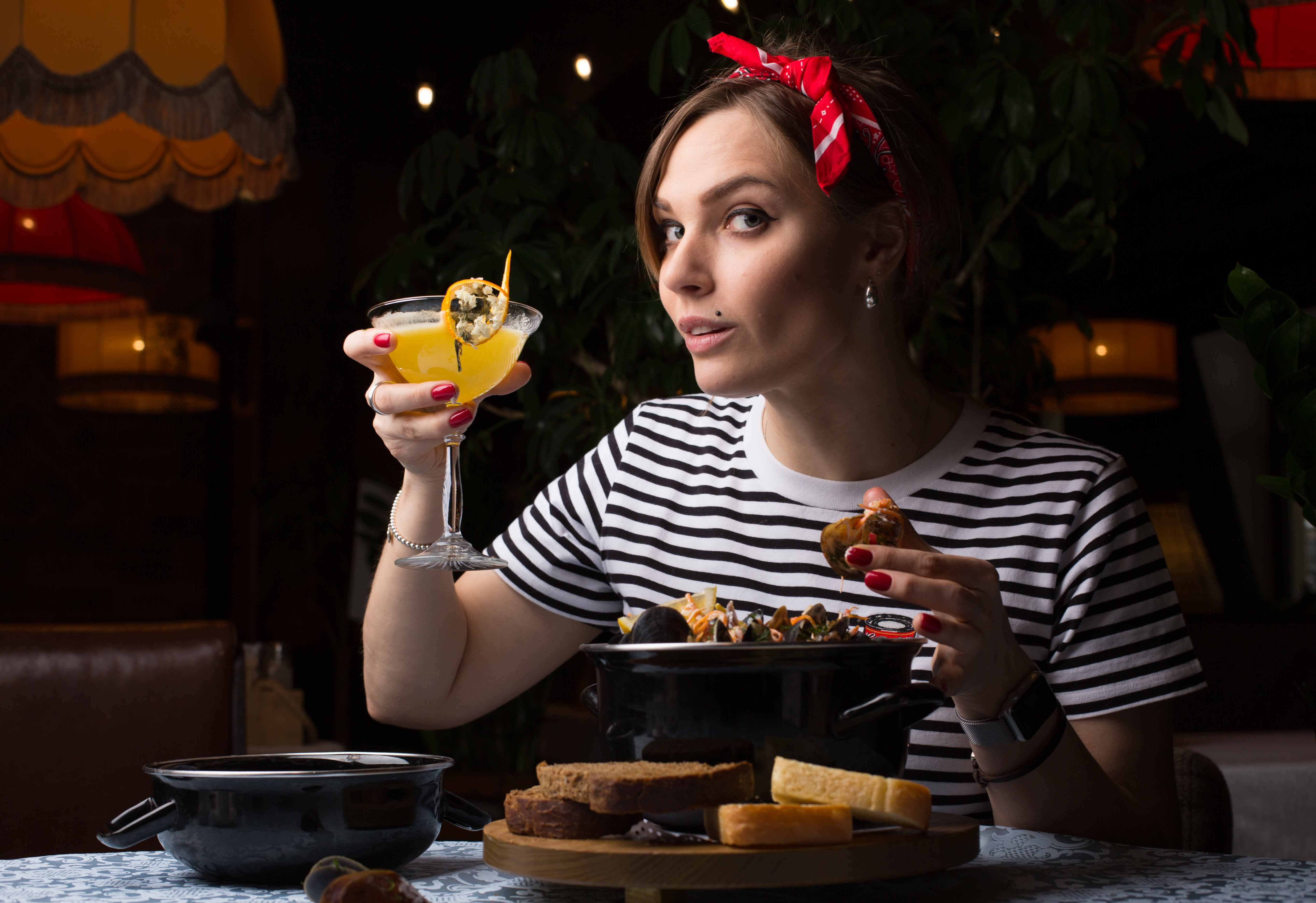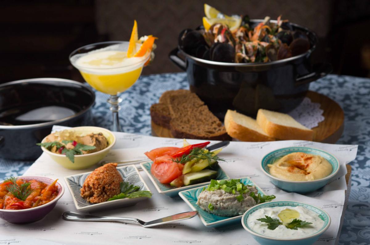 Сет одеських закусок, кілограм мідій у вершковому соусі, коктейль Com Truise (Finlandia Lime, свіжий ананас, пюре маракуї, ваніль, лайм і Martini Prosecco)