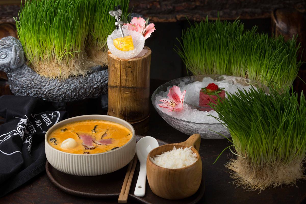 Тартар з тунця з халапеньйо, індонезійське червоне каррі з качкою, коктейль "Шовковий слінг" (Finlandia Grapefruit, малинове пюре, маракуя)