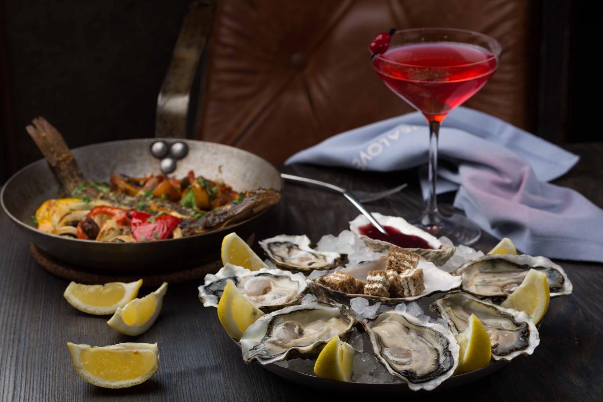 Півдюжини устриць «Голландський афінаж», камбала-плейс, смажена на сковороді з овочами по-домашньому, коктейль Finlandia Midnight Sun Magic (Finlandia vodka, морс журавлина, гренадин, лайм)