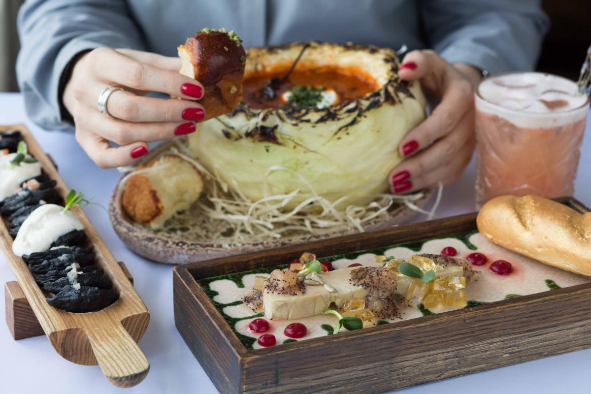 Гусяча печінка, маринована в білому вині, з желе з яблучного квасу, борщ в капусті зі свинячими вушками, чорносливом і копченою грушею, чорні вареники з судаком, копченим салом і щучої ікрою, коктейль "Лавандовое поле" (Finlandia vodka, грейпфрут, лавандовий сироп, білок)
