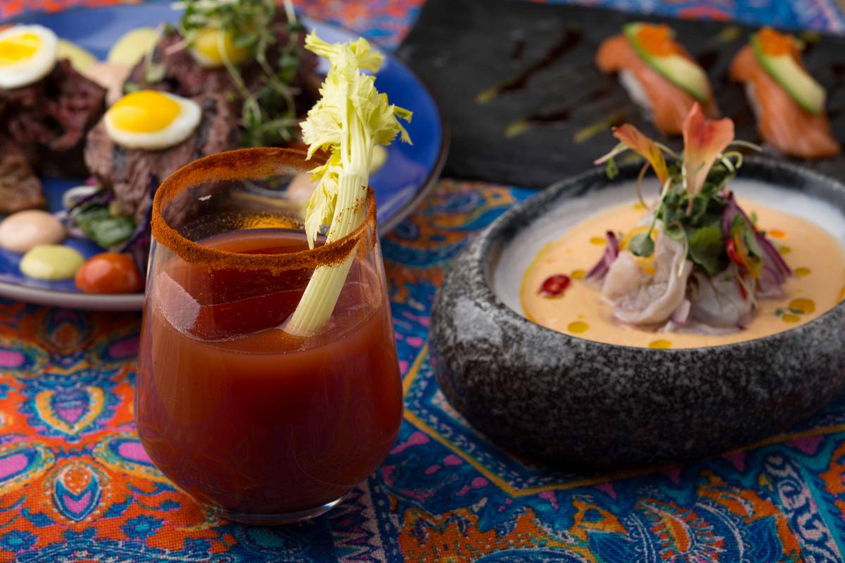 Севіче з креветок з соусом «молоко тигра», Nikkei-суші з лососем, авокадо і червоною ікрою, каусас з обпаленої яловичиною, фуа-гра та рожевою картоплею, Unusual Bloody Mary (Finlandia vodka на паприці і вишні, сік томатів, сік селери, перуанські спеції)