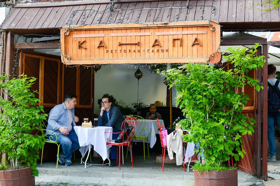 А навпроти, у "Канапі" - тихий дворик, балкон з видом на зелений схил і українські делікатеси за 3-5 євро. Той самий паштет з печінки цесарки і фазана за 129₴, філе оселедця з цибулевою губкою за 89₴, смажений телячий мозок за 129₴, знамениті чорні вареники з судаком - 129₴.