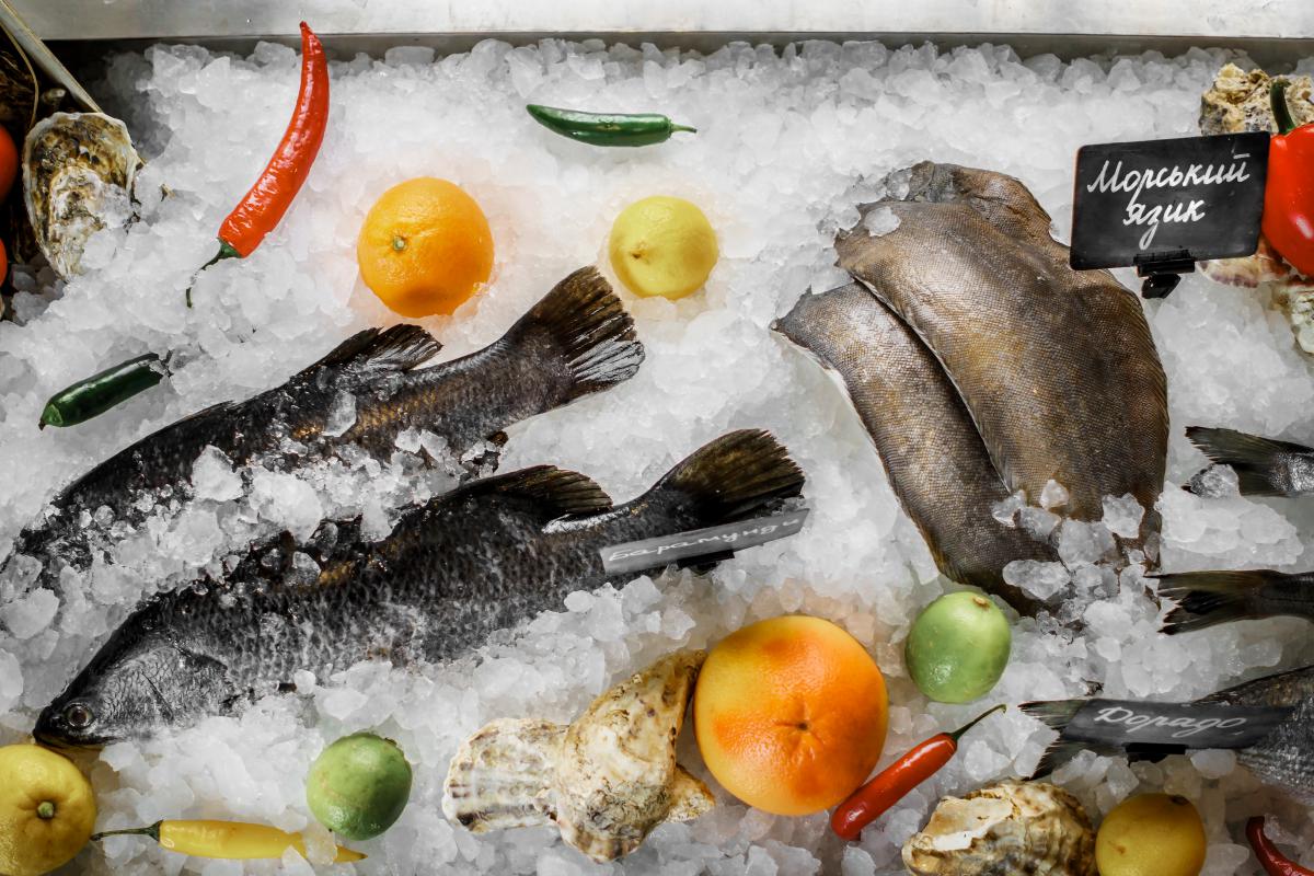 Або дику рибу з льодової вітрини: сонячника, камбалу, королівський морський язик — за 198₴/100 г.
