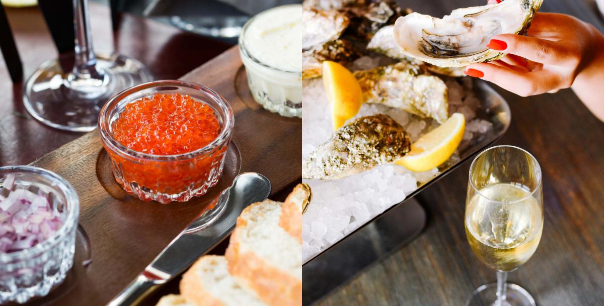 Устриця Фін де Клер (по 39 гривень) + червоний кав'яр форелі (198 гривень) + брют GASTROFAMILY (39 гривень)  = 276₴/10,5$