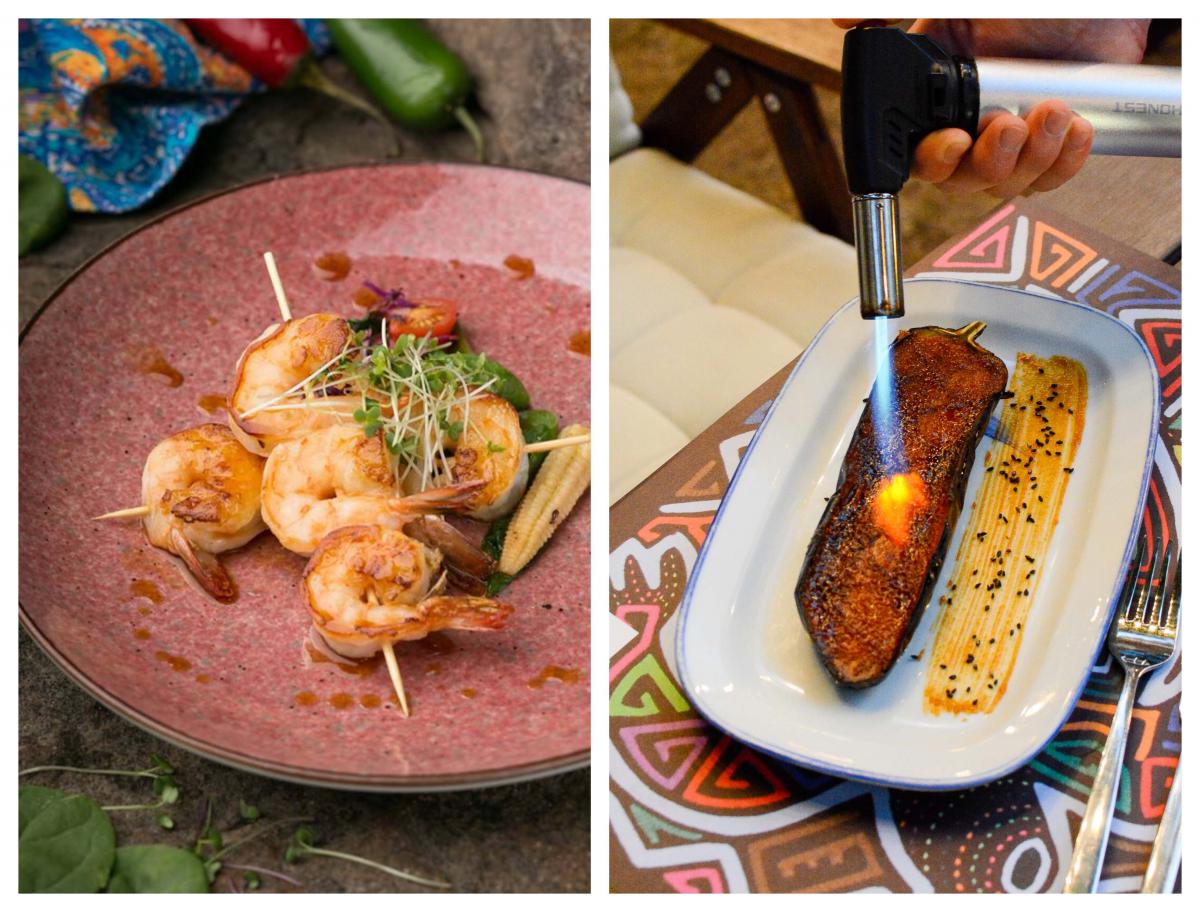 Антікучос з тигрових креветок з овочами та соусом (198 гривень) + насу-місо баклажан з карамелізованим ден-місо (69 гривень) = 267₴ /9,8$