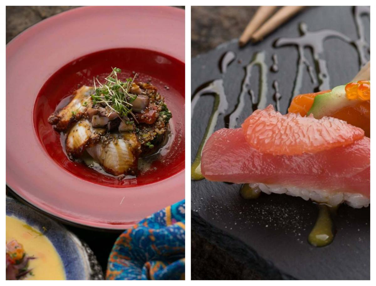 Легка та вишукана вечеря починається з келиха вина та суші в стилі Nikkei – з жовтоперим тунцем та грейпфрутом. Після цього – салат з восьминогом та копченим вугром. Смачного!