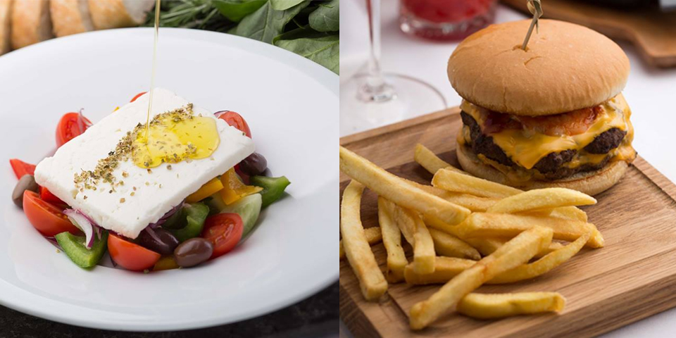Грецький салат з фетою та оливками каламата + Surf&Turf бургер із мармуровою яловичиною й тигровими креветками + узвар = 139 гривень