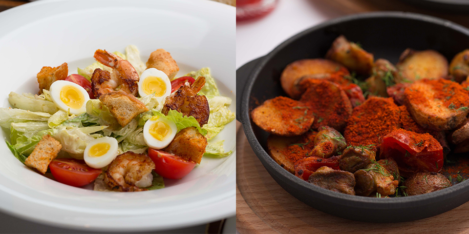 Цезар з тигровими креветками + рапани, смажені з картоплею та паприкою + журавлиновий морс = 139 гривень