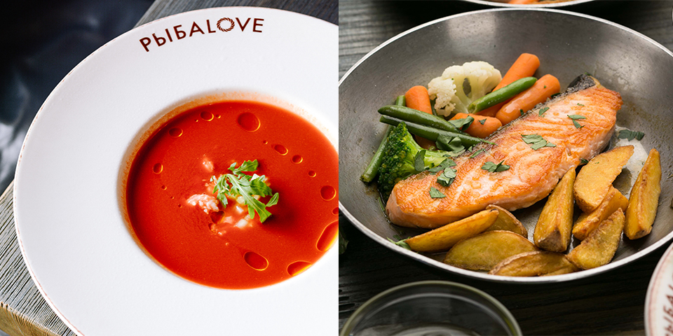 Гаспачо з креветками + філе лосося з овочами та смаженою скибочками картоплею + ягідний компот = 139 гривень