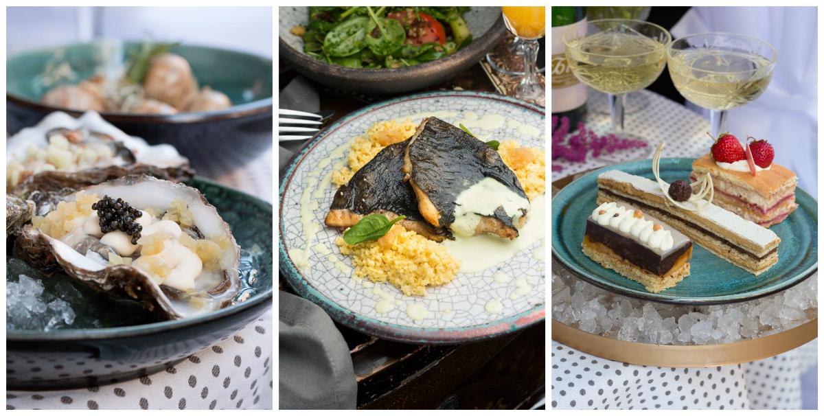 - На десерт: вівсяно-горіховий декуаз, кремю із витриманих сирів, компоте із груші та мус із вершкового сиру та шампанського