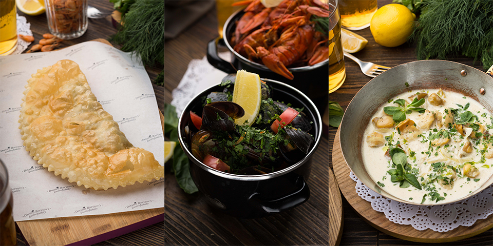 Тепер переходимо до гарячих закусок (а вони тут-як-тут): чебуреки з м'ясом по 39₴, півкіло мідій у білому вині за 89₴, рапани у вершковому соусі за 168₴.