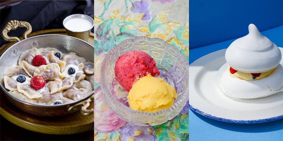 Ну, наче перекусили. Тепер, любчики, час поговорити про солодке. Так, тут і домашній "Наполеон" із заварним кремом (59₴), і безе "Павлова" (99₴), і вареники з вишнями як  у мами (99₴), і штрудель з яблуками, як любов (89₴), і сорбети різні, і морозиво (19₴).