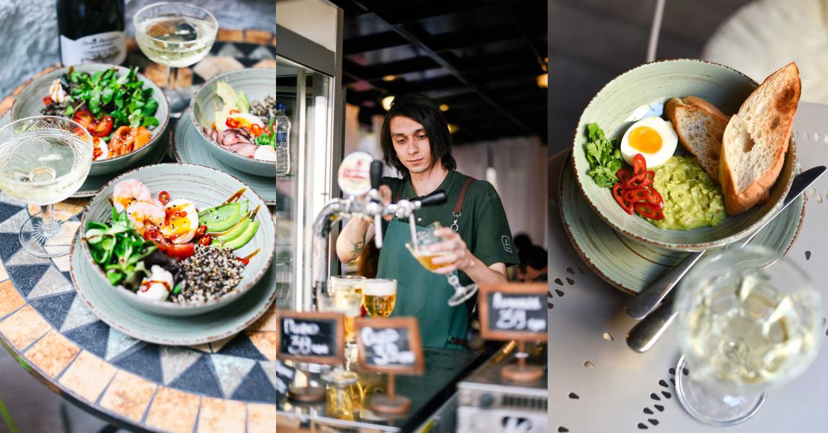 Щодня з 9 00 до 12 00 – тут подають великі сніданки з вином за 129 гривень. Масштаб гідний як Києва, так і Одеси. Спершу - сет намазок - фермерське вершкове масло, курячий паштет, джем, дзадзикі, хумус і свіжоспечений хліб. Потім – на вибір – хумус з м’яким яйцем і томатною сальсою, шакшука, круасан з лососем чи ростбіфом, ліниві вареники і ще купа різноманітної смакоти.