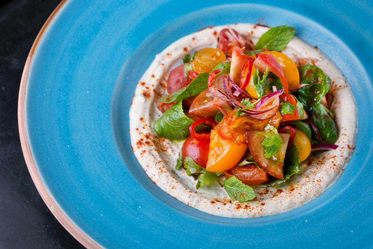 Здається, що це «звичайний салат з томатів». Однак з першої спроби зрозуміло, що йдеться про щось особливе. Гострота чилі, насичений смак в’ялених томатів та солодкуватий присмак томатів копчених – все в балансі зі свіжістю та ніжністю йогурту. Можливо, одне з найбільш яскравих та вдалих поєднань.