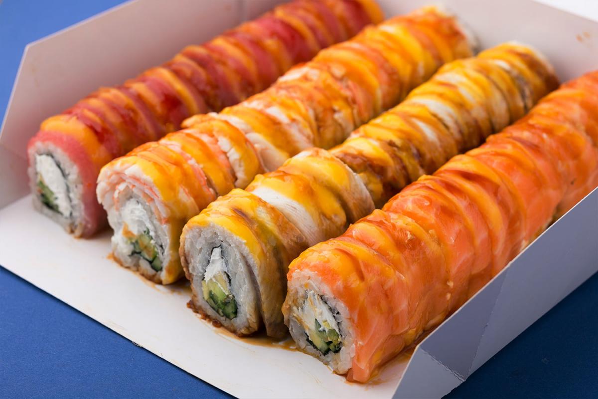 Набір ролів від шефа у подарунковій упаковці: Каліфорнія з лососем, золотий дракон з вугрем, рол з тунцем, авокадо рол, філадельфія з копченим лососем.