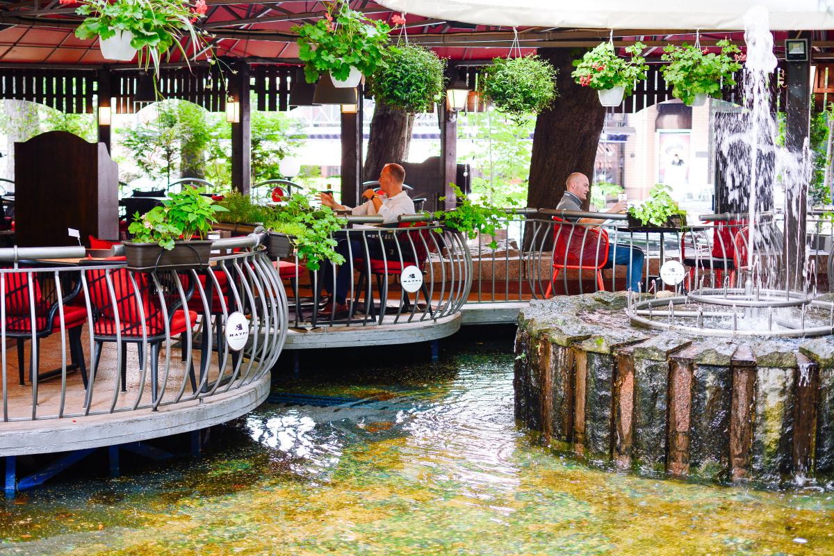Або от зупинитися тут же, на Городецького, але на літній терасі з фонтаном. Взяти вина (від 39 грн за келих), стейк (від 189 грн) або бургерів (від 98 грн).