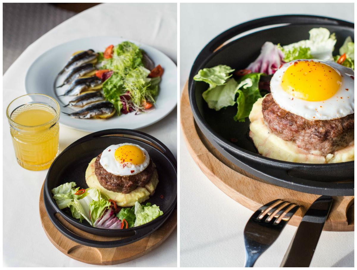 Є ще такий варіант. Печена картопля з слабосолоною тюлечкою і овочевий салат. Так смакує Одеса! Це по-перше. А, по-друге, велика порція біфштексу з яйцем та трюфельним пюре і обліпиховий морс.