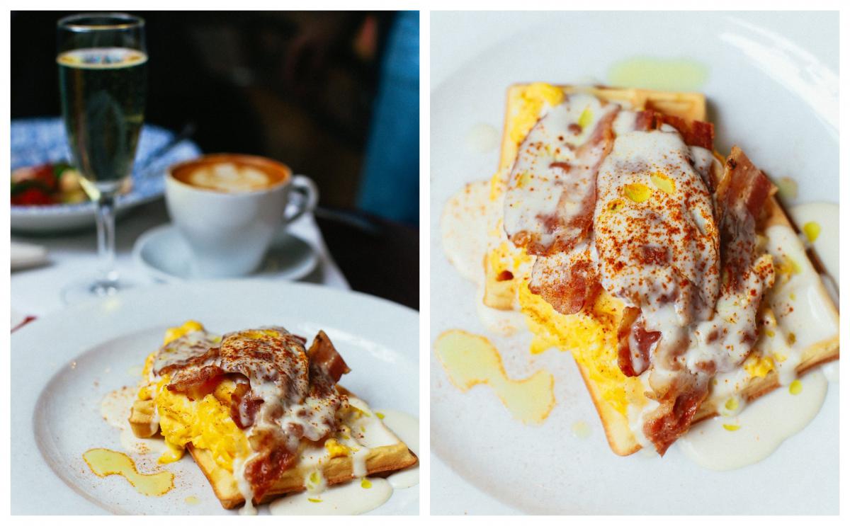 Ще одна приємна несподіванка: вафлі зі скремблом, беконом і сирним соусом (109 грн). Уявіть: м’які бельгійські вафлі, ніжний скрембл і контрастний підсмажений бекон. А сирний соус остаточно збирає до купи смаковий баланс. Тонко, поживно і сніданково! Вафлі з солоним топінгом узагалі є одним із важливих гастрономічних трендів. Не дарма ж Apple навіть спеціальні emoji з вафлями додав до нової iOS.