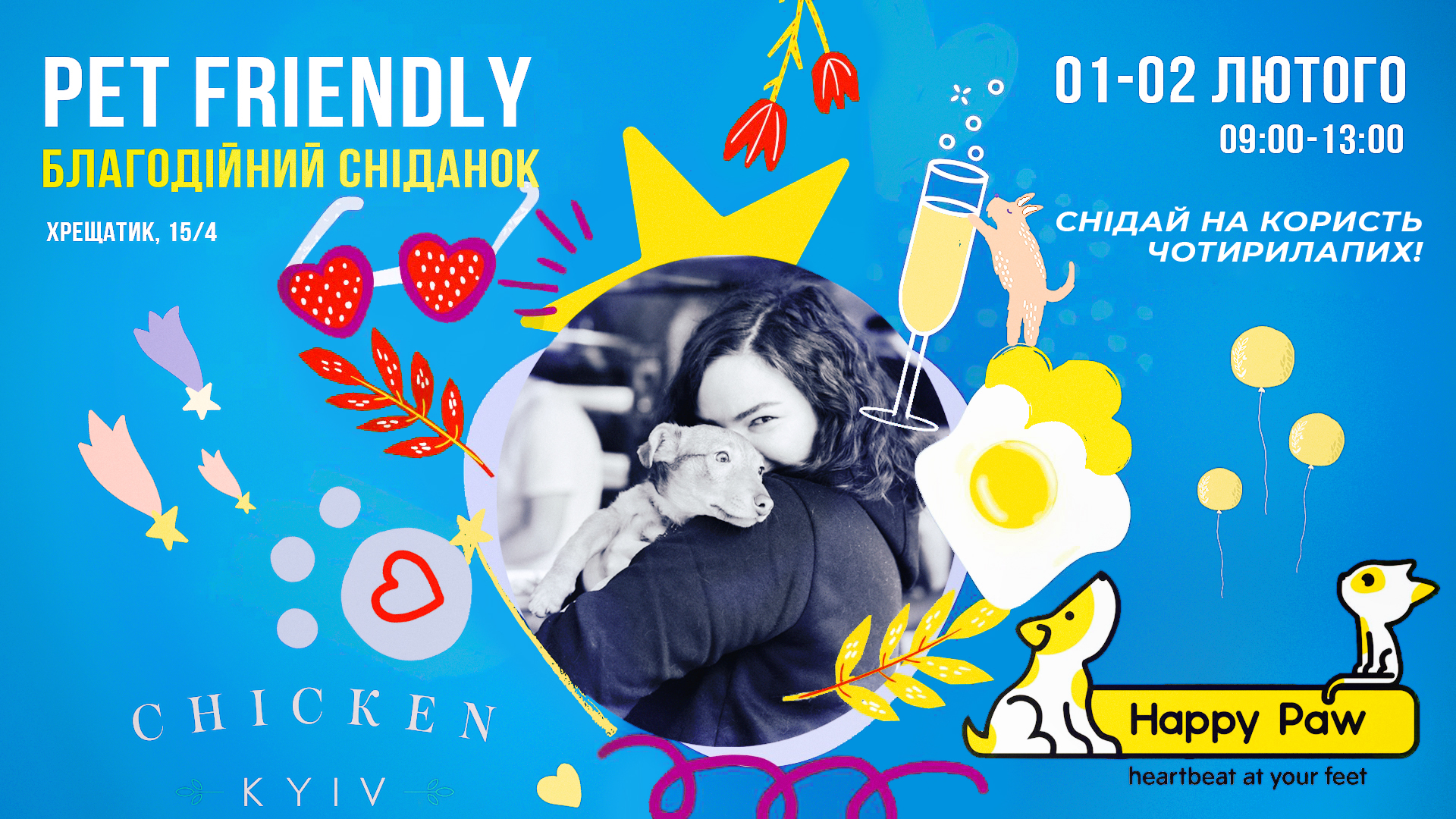 Ми подумали, чудовий привід нагадати про це — влаштувати великі Pet Friendly Breakfast! 1-2 лютого ми познайомимо вас із оновленими сніданками від Chicken Kyiv, а весь прибуток перерахуємо на допомогу безпритульним тваринам до фонду Happy Paw.