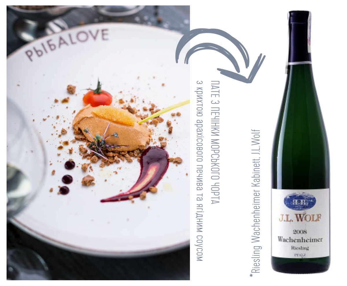 Пате з печінки морського чорта – цікава та складна страва. В самій печінці є певна гастрономічна гіркота, досить приємна. Це – солоний щукий кав’яр, кислий соус та солодке арахісове печиво – тобто суміш абсолютно різних смаків. Я довго обирав вино, яке б стало гідним партнером для такого розмаїття смакових відтінків. Зупинився на Riesling Wachenheimer Kabinett, J.L.Wolf. Рислінг – це взагалі «король білих вин», з чудовим балансом кислоти та солодкості. Саме в цій варіації рислінгу є та «залишкова цукровість», що складає гідну опозицію гіркувато-солоно-кислому смаку страви, і результаті ми маємо приємний баланс смаків.