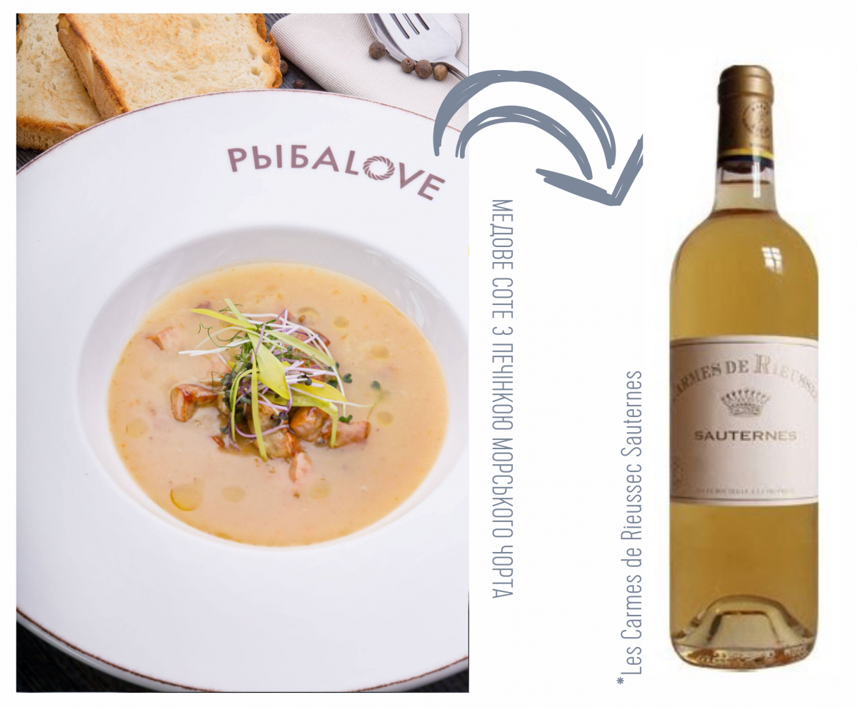 Соте з печінкою морського чорта – це дуже насичена страва, і за текстурою, а зі медово-вершковим смаком. Як сомельє я міг обрати один з двох варіантів: зіграти на контрастах або ж навпаки – підтримати цю солодкість у вині. Я обрав другий варіант і запропонував, одне з найбільш вишуканих та цікавих десертних вин - Les Carmes de Rieussec Sauternes. Сотерни мають надзвичайно потужний цікавий смак та аромат завдяки ботритізації – це процес утворення «благородної плісняви» на ягодах винограду, від чого в ягодах суттєво збільшується концентрація цукру та кислот. Відтак і вина такі мають неймовірний баланс смаку. У Франції її рекомендують до фуа-гра, гусячої печінки, ми ж рекомендуємо спробувати його і з печінкою морського чорта також.